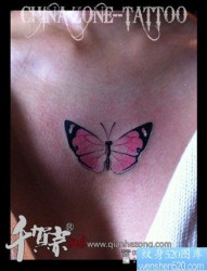 女人胸前小巧精美的粉色蝴蝶纹身图片