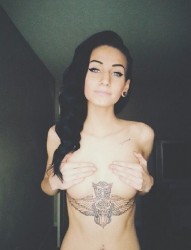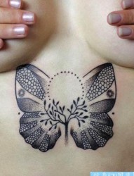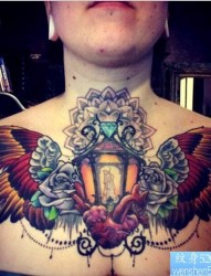 女人胸前潮流时尚的十字架翅膀纹身图片