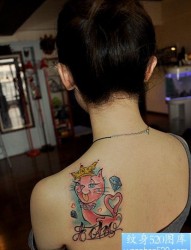 纹身520图库推荐一幅女人肩部彩色猫咪字母纹身图片