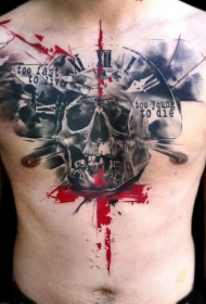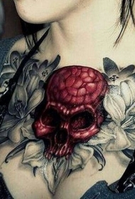 胸部幽灵般的红色骷髅和百合花纹身图案