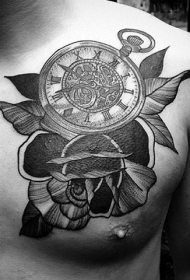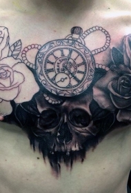 胸部骷髅和时钟玫瑰纹身图案