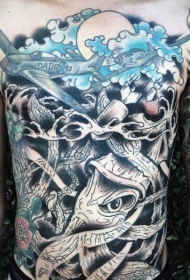 胸部和腹部彩色飞机与鱿鱼纹身图案