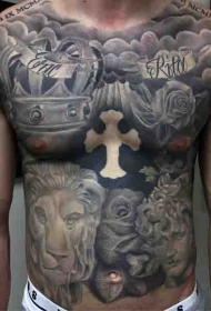 胸部和腹部大面积皇冠十字架玫瑰纹身图案