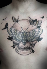 胸部有趣的彩色骷髅与蝴蝶纹身图案