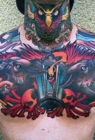 胸部和颈部old school彩色地狱犬猫头鹰骷髅纹身图案