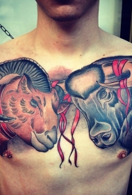 胸部old school恶魔血腥山羊头与花朵和蝙蝠纹身图案