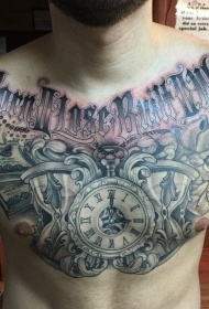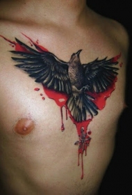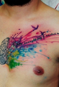 胸部五彩泼墨人脑和字母小鸟纹身图案