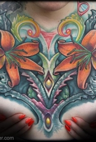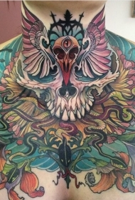 胸部大面积old school彩色蛇骷髅花朵纹身图案