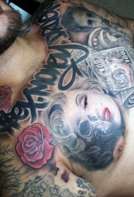 胸部骷髅玛丽莲梦露肖像与美元和字母纹身图案