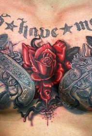 胸部华丽的手枪字母与玫瑰纹身图案