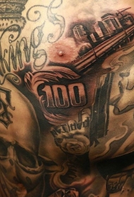 胸部怪物肖像和字母纹身图案