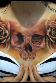 胸部逼真彩色玫瑰花与骷髅纹身图案