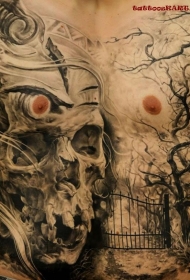 胸部写实风格骷髅和黑森林纹身图案