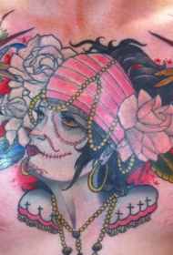 old school胸部彩色吉普赛女人花朵和鸟纹身图案