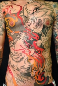胸部和腹部恶魔狗狮子鲜花和火焰纹身图案