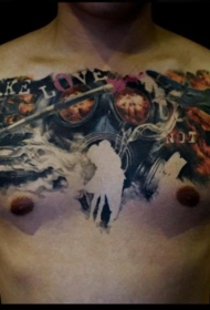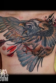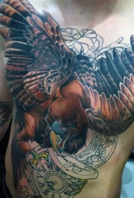 胸部惊人的彩绘老鹰和钟表字母纹身图案