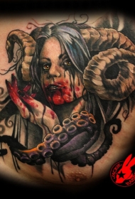胸部恐怖风格彩色血腥恶魔女人纹身图案