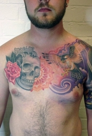 彩色骷髅与花朵飞行鹰胸部纹身图案