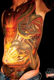 腹部神秘的彩色女巫与恶魔怪物纹身图案
