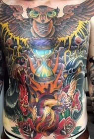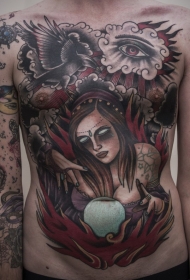 胸部old school神秘的恶魔女巫与乌鸦纹身图案