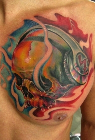 胸部彩色耳机与骷髅纹身图案