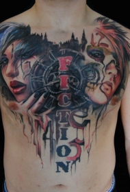 胸部神秘的彩色人脸肖像纹身图案