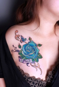 性感胸部蓝色玫瑰花纹身图案