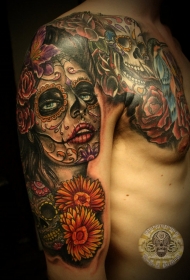 半甲墨西哥骷髅花朵和死亡女郎彩绘纹身图案
