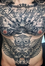胸部和腹部灰色莲花女人和猫头鹰骷髅纹身图案