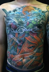 胸部和腹部五彩的军事战机和章鱼纹身图案