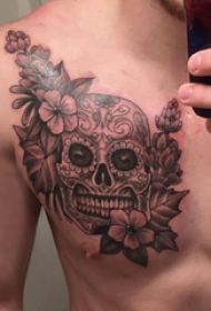 骷髅纹身 男生胸上骷髅和花卉纹身图片