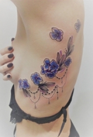 女生侧腰上彩绘渐变简单线条小清新植物花朵纹身图片