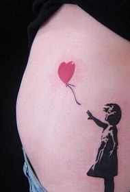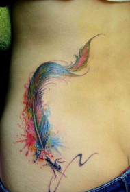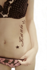 美女腰部彩绘花朵藤蔓和英文字母组合纹身图案