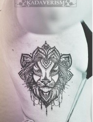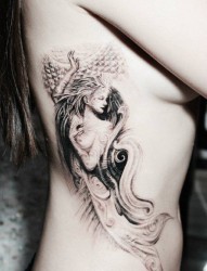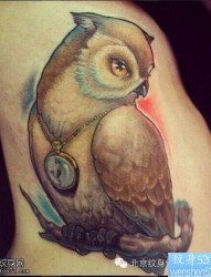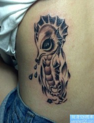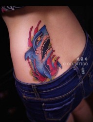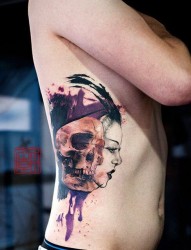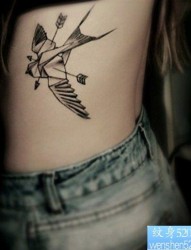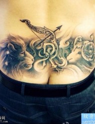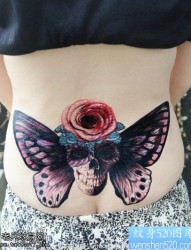 女性后腰欧美彩色蝴蝶骷髅头玫瑰花纹身图片