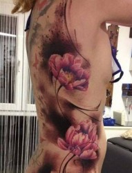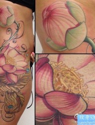 一幅女人腰部彩色莲花纹身作品