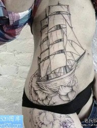 女人腰部帆船纹身作品
