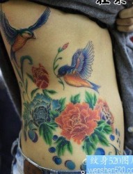 小鸟牡丹纹身图片:腰部彩色小鸟牡丹纹身图片纹身作品
