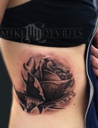 侧腰黑色玫瑰纹身图片