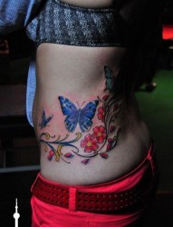 女人腰部漂亮的彩色蝴蝶花卉藤蔓纹身图片