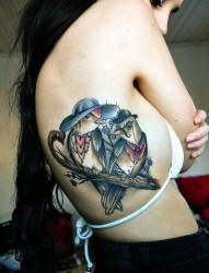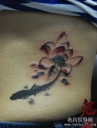 女孩子腰部水墨风格鲤鱼莲花纹身图片