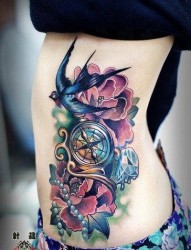 美女腰部潮流唯美的指南针燕子牡丹钻石纹身图片