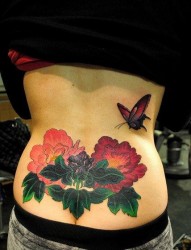 纹身520图库推荐一幅女人腰部牡丹花蝴蝶文身图片
