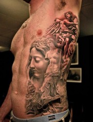 侧腰美女肖像和玫瑰纹身图片