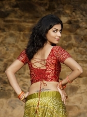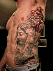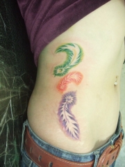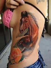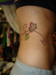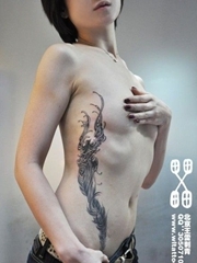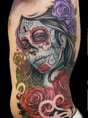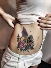 时尚美女腰部彩绘玫瑰骷髅文身图案