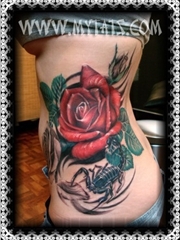女生腰部彩绘蝎子蓝玫瑰刺青