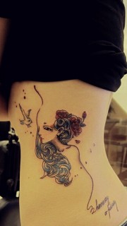 女人侧腰彩人物树纹身图案
