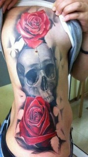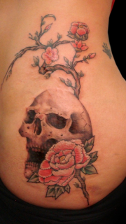 时尚达人的腰部玫瑰骷髅纹身