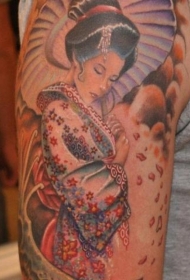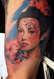 插画风格的彩色亚洲艺妓花朵手臂纹身图案