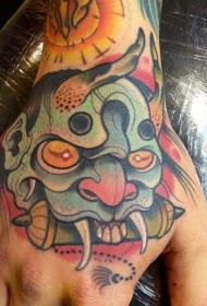 手背亚洲风格的彩色恶魔头像纹身图案