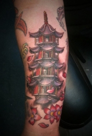 小臂漂亮的彩色亚洲寺庙与鲜花纹身图案